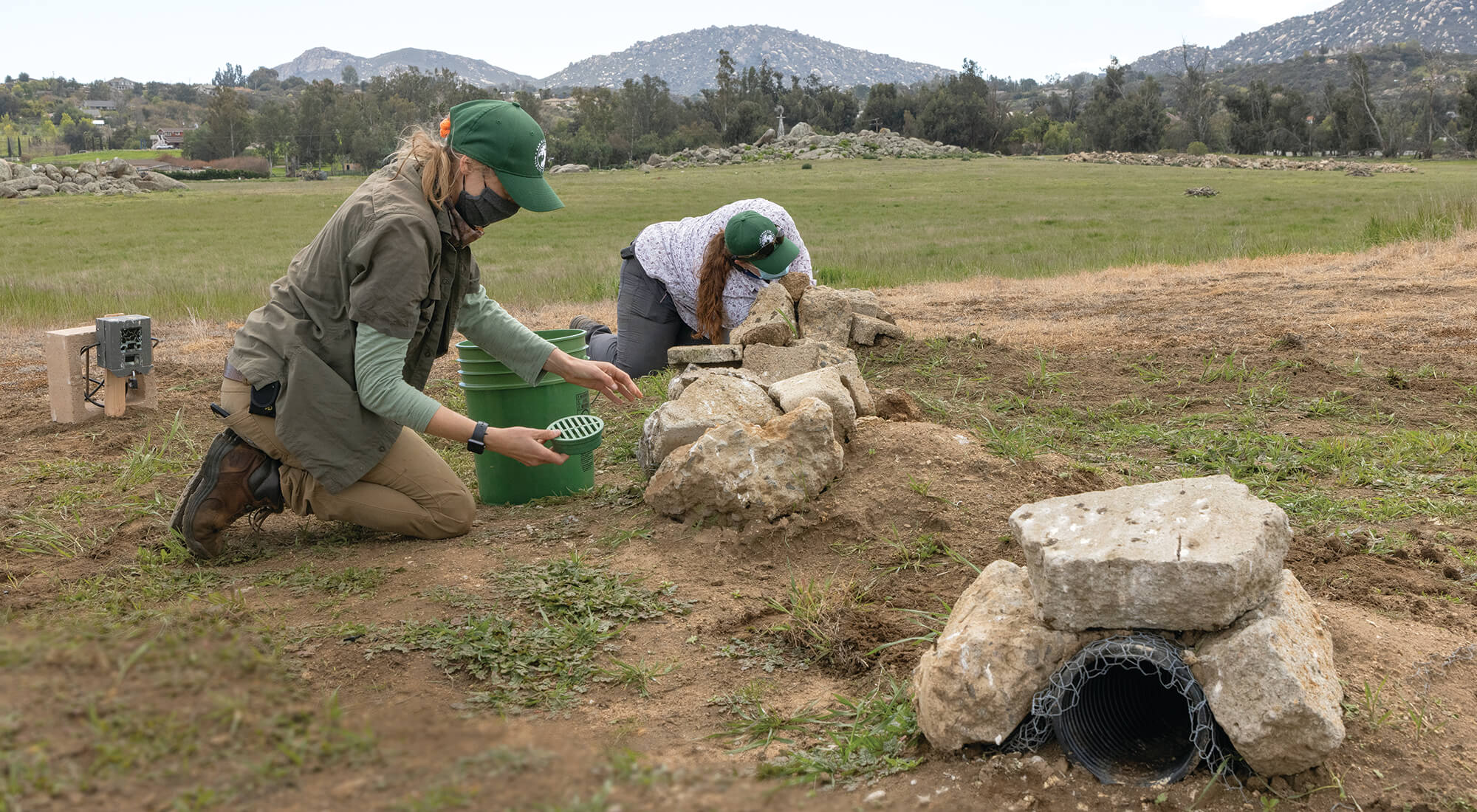 The first ingredient is supplied by our partners. Over the past 10 years, San Diego Zoo Wildlife Alliance and our working group collaborators have identified protected areas in the county that can provide owl habitat. Some of our partners, like the California Department of Fish and Wildlife and San Diego Habitat Conservancy, own and manage land for the purpose of providing protected habitat for native wildlife for generations to come. We have worked closely with these entities to prepare their lands to receive owls. They use cattle grazing and mowing to keep the grasses short, and create cover piles made of rocks or brush to help the ground squirrels disperse into new areas, creating more burrows for the owls. Our partners have allowed us to install artificial burrows that are part of the translocation process, and conduct maintenance on these burrows annually.