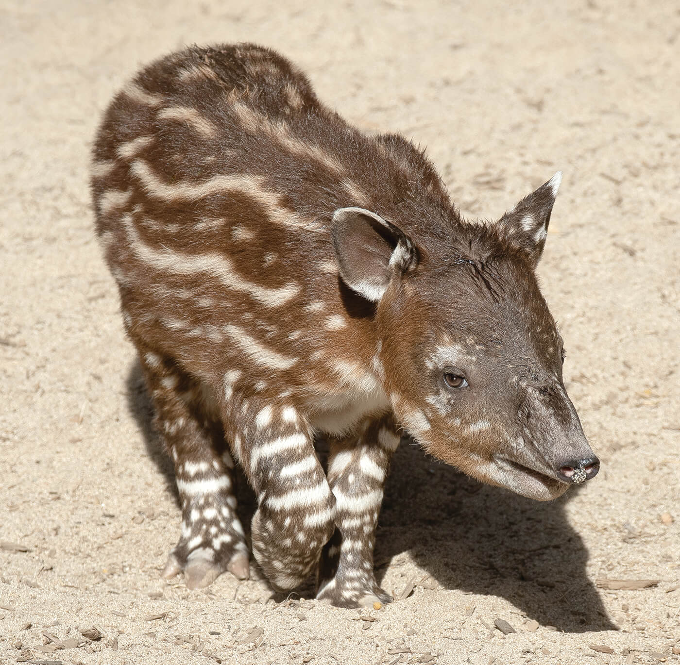 Luna is taking great care of her calf, nursing her regularly, keeping her tidy, and watching over her. The keepers were thrilled to see Luna taking readily to her maternal role. With Luna’s first calf—Don, born in 2018—she was rather overwhelmed and wasn’t able to care for him, and he required support from the keepers to feed him bottles of milk. This time, however, everything has gone according to plan, and the roly-poly calf is able to take advantage of her mother’s full attention. “She is feisty and fun, and communicates with little chirps,” said Kimberly Hyde, a senior keeper at the Zoo. A tapir calf’s spots and stripes serve as camouflage in the dappled light of their native forest habitat. They start to lose the markings after a few months, and they resemble miniature adults at about eight months of age.