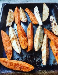 make sure when cutting sweet potatoes they are of similar size so that they cook evenly