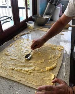 Spread the softened butter over the dough using the back of a spoon. Sprinkle the brown sugar & cinnamon onto the buttered dough, pressing them gently onto the dough.