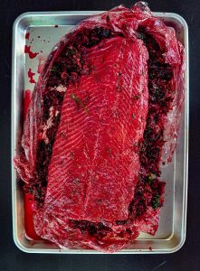 After 24 hours flip the salmon over and weigh it down again. CAREFUL OF THE BEETROOT and your hands!