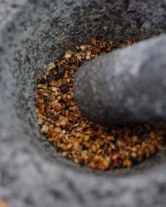 Crush the juniper, coriander & black pepper together using either a pestle & mortar or spice blender.