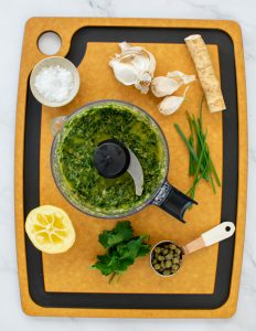 Make salsa verde, carrot top pesto and prep the rest of the vegetables.