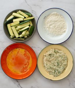 Get 4 plates and place flour on one, beaten egg on another and a mix of panko, parsley & parmesan on the 3rd. The breaded zucchini