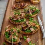 Grill/toast the bread, top withcrushed peas, salmon and some of the sauce. Add some sushi ginger, sesame seeds and pea shoots to finish