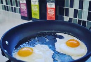 when frying eggs, if you want to get a lovely sunny side up egg without burning the bottom of the whites, then I recommend placing a clean frying pan or saucepan lid on top of the pan you are cooking the egg in. This speeds up the time it takes to set the whites and leaves the underneath nice and soft too