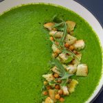 Place soup in bowl and either in the centre or to the side place croutons & chickpeas. Place a couple leaves of rocket on top and finish with freshly ground black pepper