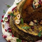 Place labneh on center of plate and swirl to make a "pool"of labneh. Place pumpkin on top and then scatter chopped hazelnuts, pomegranate and parsley over. I like to use maldon salt to finish too but it's not "essential"