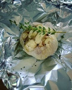 Place garlic inside tin foil on baking sheet and drizzle with olive oil. Sprinkle with salt and add a sprig of thyme. Wrap and place in the oven @ 150c for 45 - 50 mins or until garlic has caramelized slightly