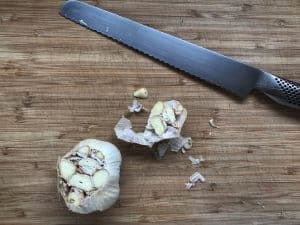 Using a serrated knife chop the top off the garlic to expose the bulbs - roughly 1/4 off the top